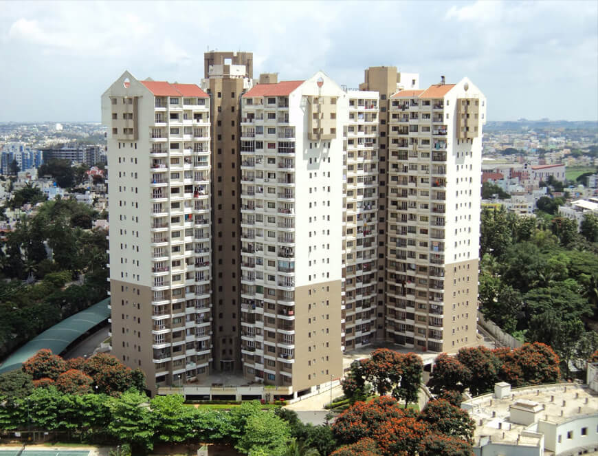 Built on over 35 acres of gently sloping land off Bannerghatta Road. Bangalore. L & T South City consists of 2070 apartments in 18 towers having 2 basements and 20 upper floors, with a large club, South house City was the First project to be built using Tunnel-Form construction, which uses mild steel tunnel formwork with poured-in-place concrete for major walls and floor slabs, and results in fast construction. Pre cast concrete balcony railings and staircases were another feature of the construction. The project commenced in 1996 and had a total built area of about 327,000 square meters. An exclusive park of over 5 acres and a coverage of less then 12% provides for large open spaces affording privacy, lights & ventilation for all flats.