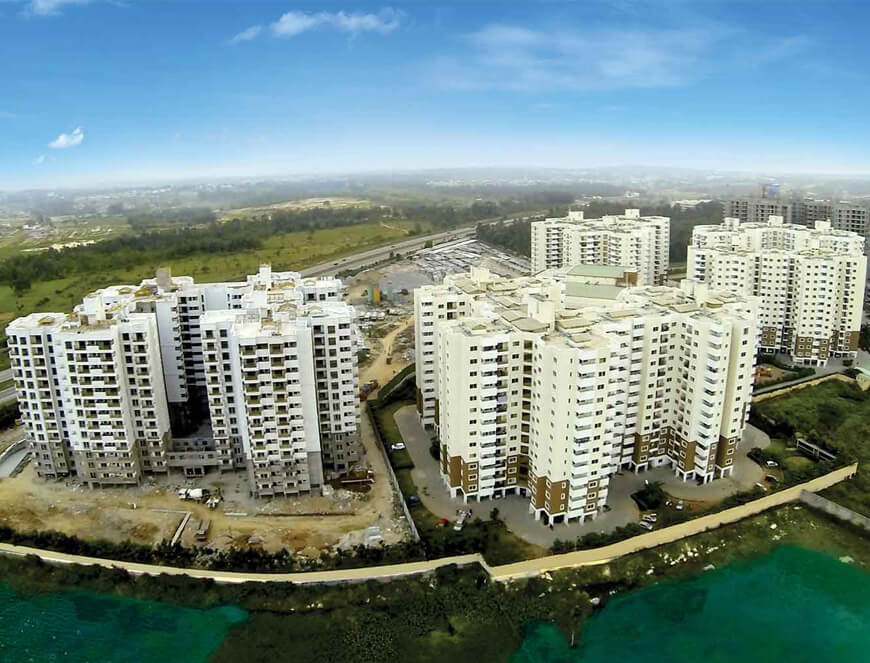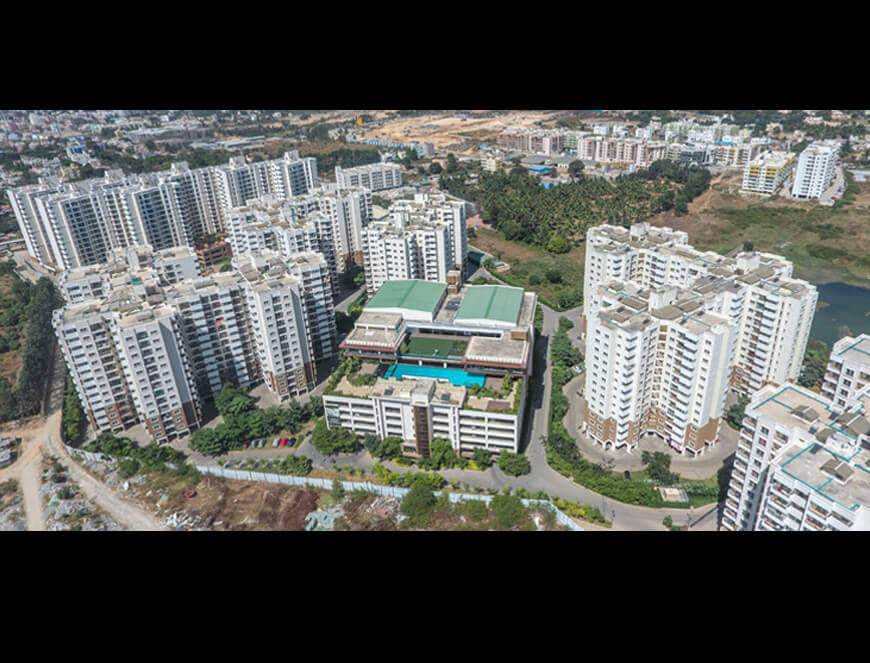 The 26 acre plot for this project presented its own challenges of planning due to the multiple jurisdictions over the land which created difficulties in integration of the whole. A small natural water body was at the boundary of the 2 separate jurisdictional plots. This was expanded and created as an activity zone & open space between the phases of development. Phase I was conceived as affordable housing and has apartments from 950sft to 1600sft. All the 5 clusters are only 13 floor high with only one cluster having a basement. A multi-level car-parking structure was located adjacent the Sewage Treatment Plant, the roof of which accommodates 2 tennis courts. A 3-level club house sits on top of the car-park structure. Judicious alignment of the 5 clusters resulted in comfortable open spaces between blocks which are used by residents as children & senior citizen areas. Phase II consists of 7 interlinked blocks on a 3-level parking structure with a separate clubhouse and swimming pool at the podium level. The apartments range from 3 to 4 bedroom with area of 1800 sft and above. Combined built-up areas for phase I & II added to 3,33,940 Sqm with 1945 apartments.