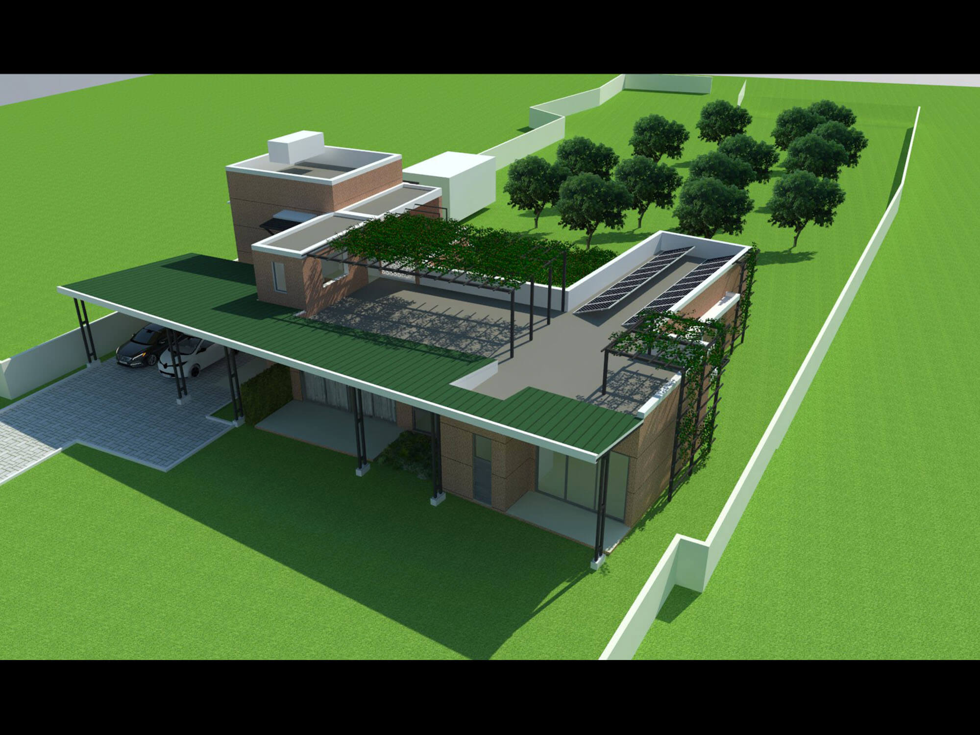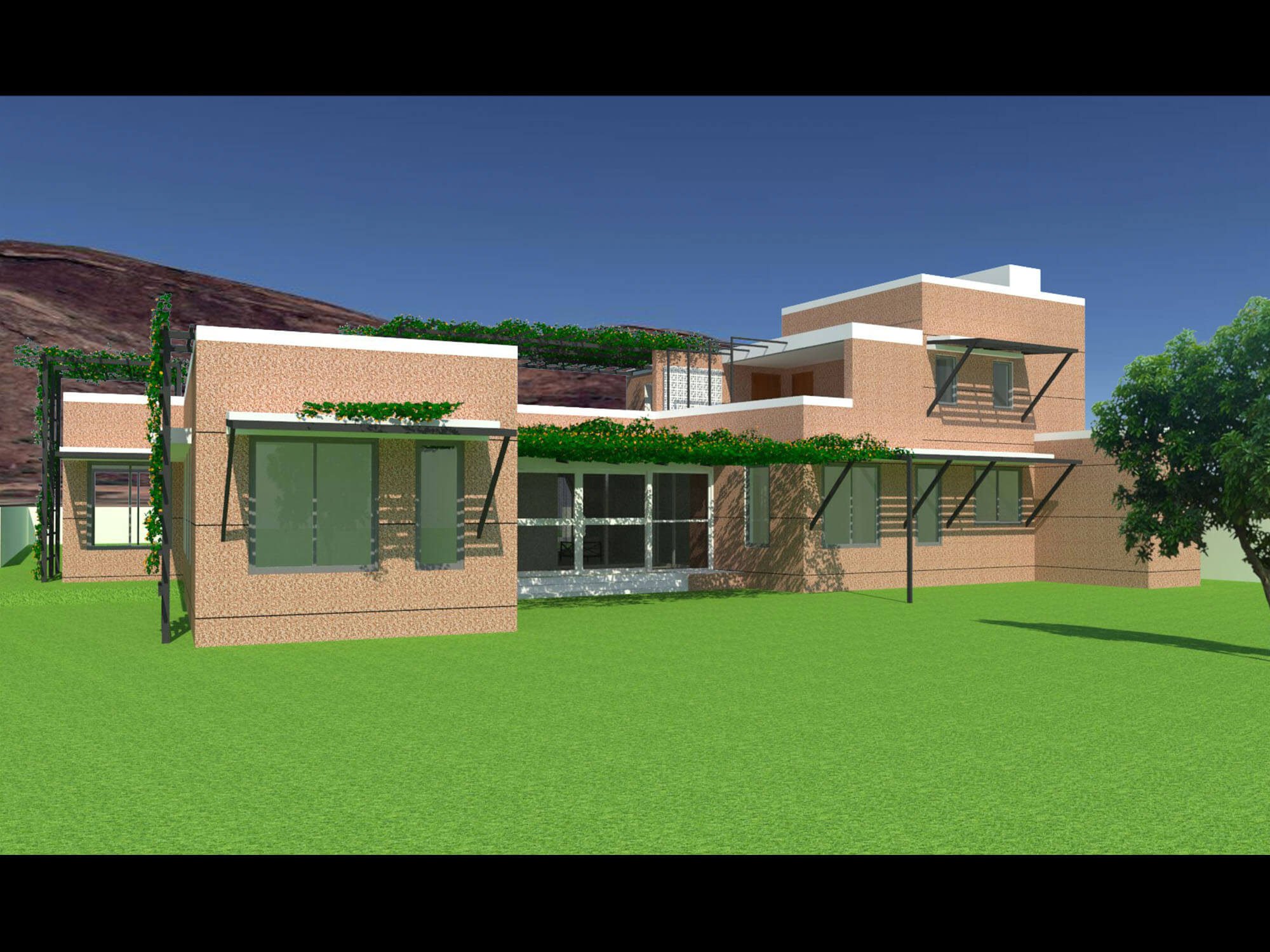 This house for a doctor couple is set in a narrow plot of an acre or so in a rapidly urbanizing suburb of a small town. The planning of the house attempts to limit exposure to the possibly dense future development at close proximity on the two sides while orienting all principal spaces to garden spaces within the plot. The exposure to east and west which this entailed as well as the generous outdoor living spaces are protected deep roof projections.